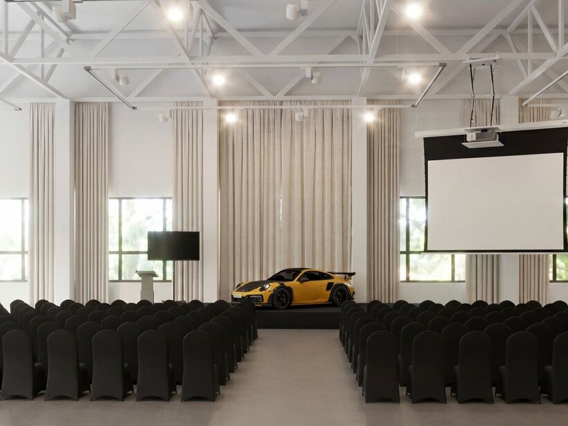 Przestronna sala konferencyjna z surowymi ścianami, nowoczesnym oświetleniem i ustawieniem krzeseł do spotkań biznesowych.