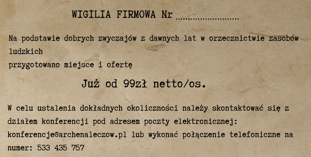 Zachęć swoich pracowników do świętowania wyjątkowych chwil w gronie zespołu! Nasz pakiet wigilii firmowej to doskonała okazja, aby podziękować im za trud i zaangażowanie, które wkładają w swoją pracę. Skontaktuj się z nami aby ustalić szczegły: