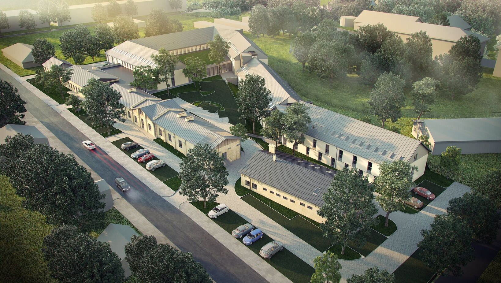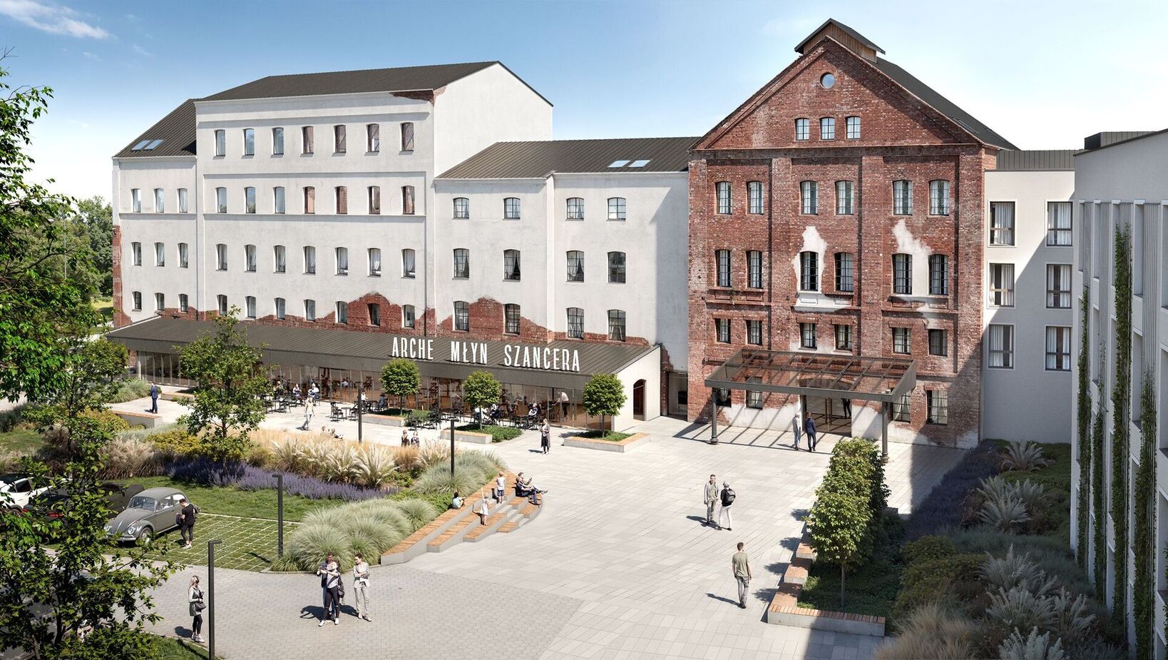 Modern hotel courtyard with red umbrellas, comfortable seating areas, and decorative plants for guest relaxation.