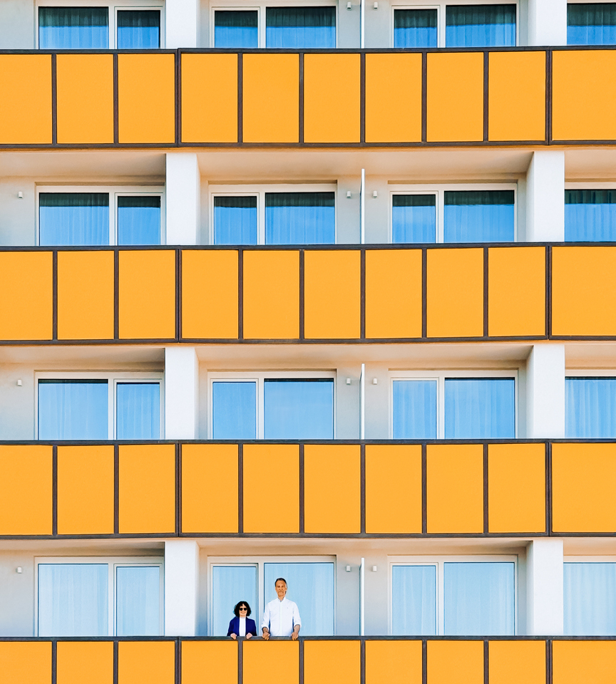 Hotel room with two single beds, exposed brick wall, yellow throws, and a large balcony overlooking greenery.